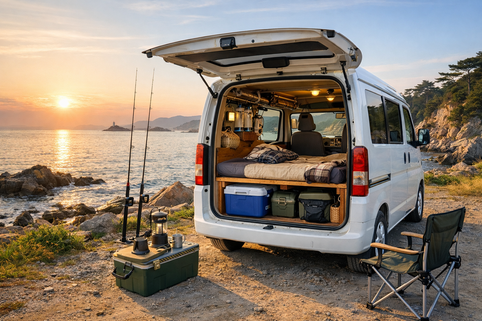 車中泊 釣り車中泊の始め方|軽バンで釣り旅を楽しむ装備と車内レイアウト